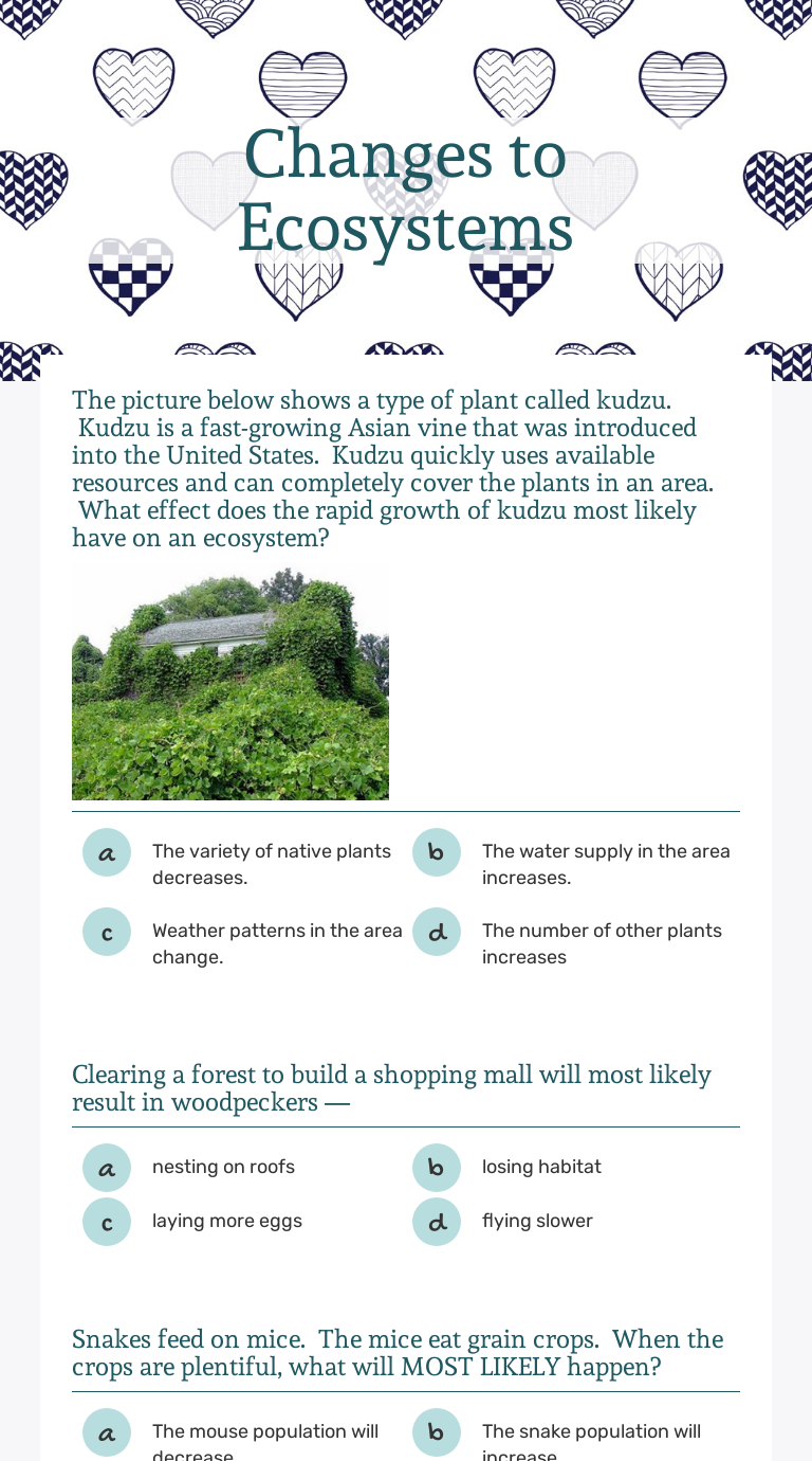 PDF Grade 7 Science Unit 1: Interactions Within Ecosystems 2. Which of the following ecosystems can be found in Newfoundland and Labrador? A. desert B. pond C. prairie D. rainforest 3. Which option arranges the given levels of environmental organization from smallest to largest? A. ecosystem, species, individual, population B. individual, community, population, ecosystem Key Answer Population Ecology Population dynamics can be studied at the landscape level, and this is the link between landscape- and population ecology Psat/NMSQT answer explanations The quiz is 2 pages and includes a teacher answer key No category Some of the worksheets displayed are Population community ecosystem work name, Ecological interactions activity student handout ... Free Ecological Lesson Plan / Hierarchy / Populations, Ecosystems, Activity Worksheet Community: the different populations of species that interact with each other in an area. Humans live in a community—everyone is different and they all have different professions, but they all interact with each other. The same is true for animals. Different animal species live together and rely/ interact with each other. PDF Ecology Worksheets - Norfolk Public Schools Ecology Worksheets Principles of Ecology Lesson : The Science of Ecology Lesson : Flow of Energy ... An important ecological issue is the rapid growth of the human population. _____ 5. A community is the biotic component of an ecosystem. _____ 6. An ecosystem is always closed in terms of energy.