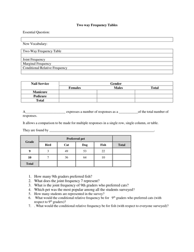 Two-Way Frequency Tables Notes and Worksheets - Lindsay Bowden These two-way frequency table notes and worksheets are meant for an Algebra 1 statistics unit. However, they can also be used in middle school. They cover: Reading two-way frequency tables Finding joint, marginal, and conditional relative frequencies Creating two-way frequency tables See preview to view all pages! 4 pages + answer keys.