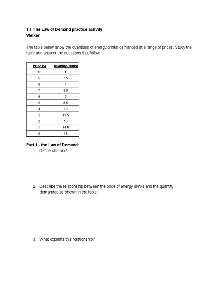 DEMAND WORKSHEET - Antioch Unified School District DEMAND WORKSHEET The law of demand states- when the price increases, the quantity demanded will ___________. When the price decreases, the quantity demanded will _______________. If a change in price has an effect on the change in quantity, this is known as ( elastic / inelastic ) demand. Give a specific example of this type of demand. Law of Demand - WallStreetMojo The law of demand is the concept of economics. The prices of the goods or services and their quantity demanded are inversely related when the other factors remain constant. In other words, when the price of any product increases, then its demand will fall, and when its price decreases, its demand will increase in the market.