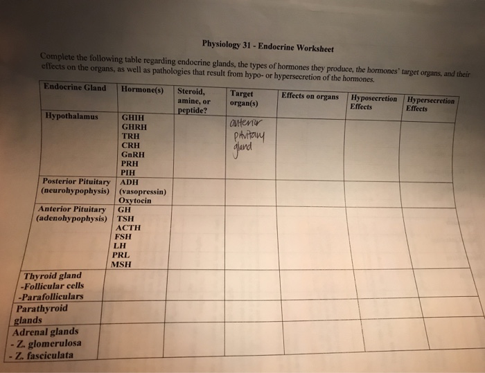 Endocrine System Worksheet - WikiEducator a. Endocrine glands release their secretions directly into the blood. In other words they have no ................... b. Endocrine glands secrete chemicals called .................... c. Hormones are transported from the endocrine glands to all parts of the body by the .............................. d. Endocrine System Worksheet Flashcards | Quizlet These are the answers to the endocrine worksheet for VET 116 (we didn't have a test) Terms in this set (28) What are the chemical messengers for the endocrine system called? Hormones They are secreted by endocrine glands into the.... bloodstream. Briefly explain the negative feedback system that controls most hormone secretion. PDF Endocrine System Hormones Worksheet - University of Pittsburgh at Bradford Endocrine System Hormones FILL IN Handout *Make an appointment with the ACTC if you need help with this handout! Epinephrine and Norepinepherine Adrenal Medulla Glucagon Pancreas alpha cells Insulin Pancreas beta cells ... Endocrine System Hormones Worksheet Author:
