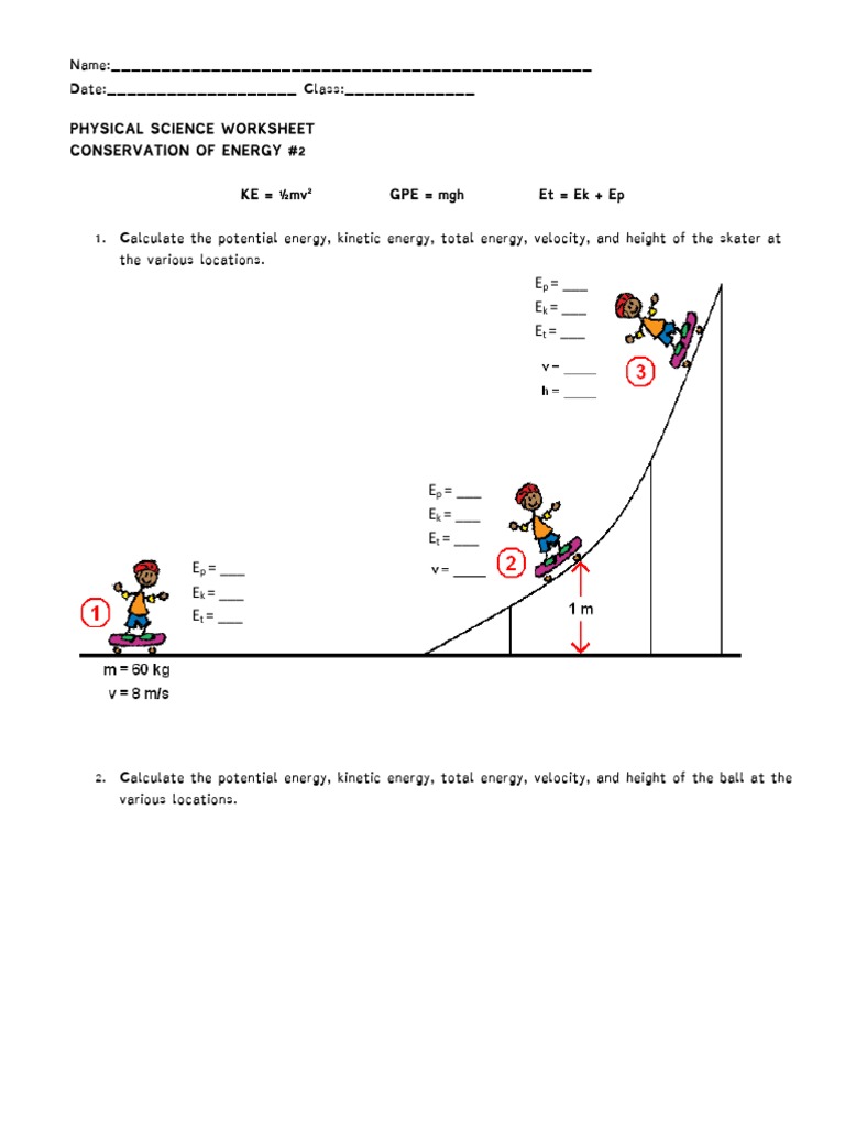 PDF Physical Science Worksheet Conservation of Energy #2 PHYSICAL SCIENCE WORKSHEET CONSERVATION OF ENERGY #2 KE = ½mv2GPE = mgh ME = KE + GPE 1. Calculate the potential energy, kinetic energy, mechanical energy, velocity, and height of the skater at the various locations. 2. Calculate the potential energy, kinetic energy, mechanical energy, velocity, and height of the ball at the various locations. 3.