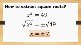 Solving Quadratic Equations by Square Root Method - ChiliMath Key Strategy in Solving Quadratic Equations using the Square Root Method. The general approach is to collect all {x^2} terms on one side of the equation while keeping the constants to the opposite side. After doing so, the next obvious step is to take the square roots of both sides to solve for the value of x.