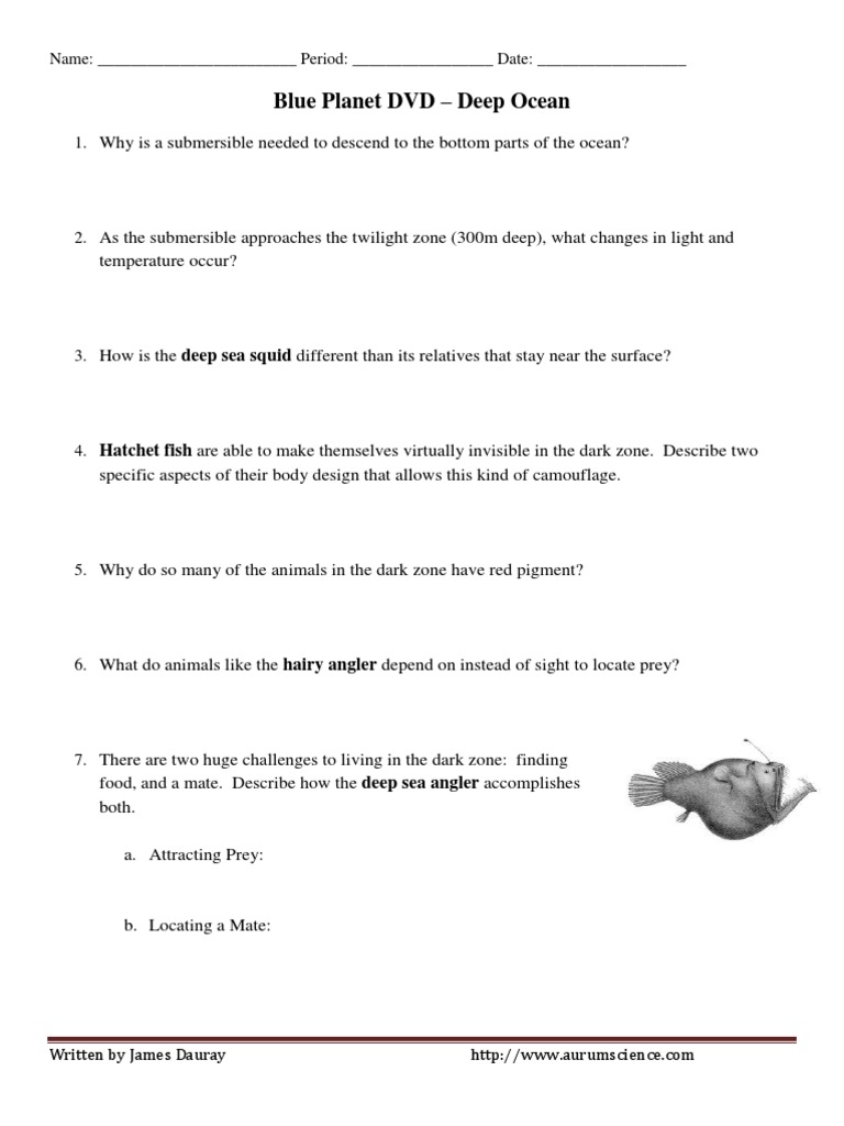 5 why do so many of the animals in the dark zone have - Course Hero 9. Bioluminescence is also used by prey, such as the shrimp and copepods to escape predators like the gigantocypris.Describe two examples shown. The shrimp releases a blue light that attaches itself to the predator, so then they can be seen, and an easier target to other predators. They also release flashes of light that distracts the predator. They can create flairs with their bodies that ... Blue Planet Open Ocean Worksheets & Teaching Resources | TpT Video Response Worksheets 2 $0.75 PDF Activity This Video Response Worksheet and Key is based on the BBC documentary series "The Blue Planet (2001) - Episode 3: Open Ocean" as narrated by David Attenborough.You will receive a PDF file which contains a Video Response Worksheet and Key and a TpT Digital Activity for students (worksheet only).Video PDF OcEanOGraphY - troop577wichita.weebly.com .our Blue planet Our Blue Planet In some way, the oceans touch every part of Earth. The oceans cover more than 70 percent of our planet and are the dominant feature of Earth. Wherever you live, the oceans influence the weather, the soil, the air, and the geography of your community. Apollo astronauts hurtling toward the moon looked back at a