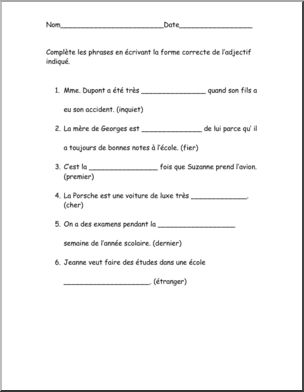 French possessive adjectives worksheet. Unit 8 - Exercise 2 - Superlative adjectives | Solutions | Oxford ... Unit 8 - Exercise 2 - Superlative adjectives. Complete the sentences. Use the superlative form of the adjectives in brackets. Learn French Adjectif Possessif - Otosection see also: adjectif and adjective types. possessive adjectives indicate ownership or possession. the english possessive adjectives are my, your, his, her, its, our, and their. french has many more possessive adjectives because they have to agree in number and sometimes gender with their nouns. singular subjects have three possessive adjectives. … Possessive Adjective: Pengertian, Contoh Kalimat Bahasa Inggris Contoh Kalimat Possessive Pronoun dan Possessive Adjective. Mine is the biggest one. My house is the biggest one. (Rumahku adalah yang terbesar.) The city is mine. The city is my hometown. (Kota tsb adalah kampung halamanku.) Yours was sent yesterday. Your letter was sent yesterday. Paul and his sister in french - hhc.diamondcrystalmusic.shop Paul Claudel ( French: [pɔl klodɛl]; 6 August 1868 - 23 February 1955) was a French poet, dramatist and diplomat, and the younger brother of the sculptor Camille Claudel. He was most famous for his verse dramas, which often convey his devout Catholicism. Claudel was nominated for the Nobel Prize in Literature in six different years. [1] Contents.
