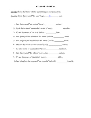 Exercise 4: Position of adjectives - Oxford University Press Students > Project > Level 1 > Unit 3 > Grammar > Exercise 4: Position of adjectives. Unit 1. Unit 2. Unit 3. Unit 4. Unit 5. Unit 6. Possessive Adjectives Exercises In French we need to change the possessive adjectives with regards to the gender of the noun. We also use possessive pronouns after a noun of. A possessive pronoun is used instead of a noun. Note the spelling of the possessive its. Our car is fast. The possessive adjectives in English also called possessive determiners are. French grammar parts - hbpsrh.apartamentymackiewicza.pl French grammar parts French has a gerund, but it has different uses from those in English. Using possessives with pronominal verbs to refer to body parts. In expressions that involve body parts, like les mains (the hands) and les cheveux (the hair), French uses a pronominal verb, like se laver (to wash) or se brosser (to brush). JoliFrench - Free French Lessons List of French prepositions with examples and test; How to use ne…pas in French; Practice your French pronunciation online; Qui and Que, and what about Dont? When to use partitive articles in French; French Possessive Pronouns - Explanation and Exercises; French Stressed Pronouns (Exercises and Grammar) French Possessive Adjectives ...