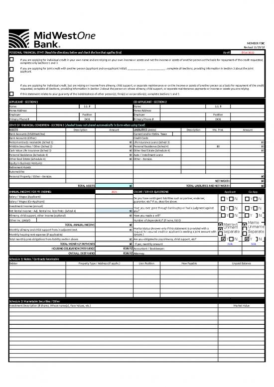 XLS Peoples Bank & Trust Personal Financial Statement Personal Financial Statement as of: Home Phone: Home Email: Name(s): Address: Bus. Phone: Bus. Email: Soc. Sec. #: Home (spouse, if joint statement) Cash Value of Life Insurance Dividends and Interest Employer's Phone Number Equity in LLC's, S-Corp's or Other Businesses Credit Limit Outstanding Balance Have you ever ...