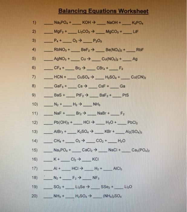 PDF Balancing Equations Worksheet - My Chemistry Class Balancing Equations Worksheet - Answers Note to students: It is acceptable to leave spaces blank when balancing equations - blank spaces are interpreted as containing the number "1". 1) 1 Na 3 PO 4 + 3 KOH 3 NaOH + 1 K 3 PO 4 2) 1 MgF 2 + 1 Li 2 CO 3 1 MgCO 3 + 2 LiF 3) 1 P 4 + 3 O 2 2 P 2 O 3 4) 2 RbNO 3 + 1 BeF 2 1 Be(NO 3) 2 + 2 RbF ...