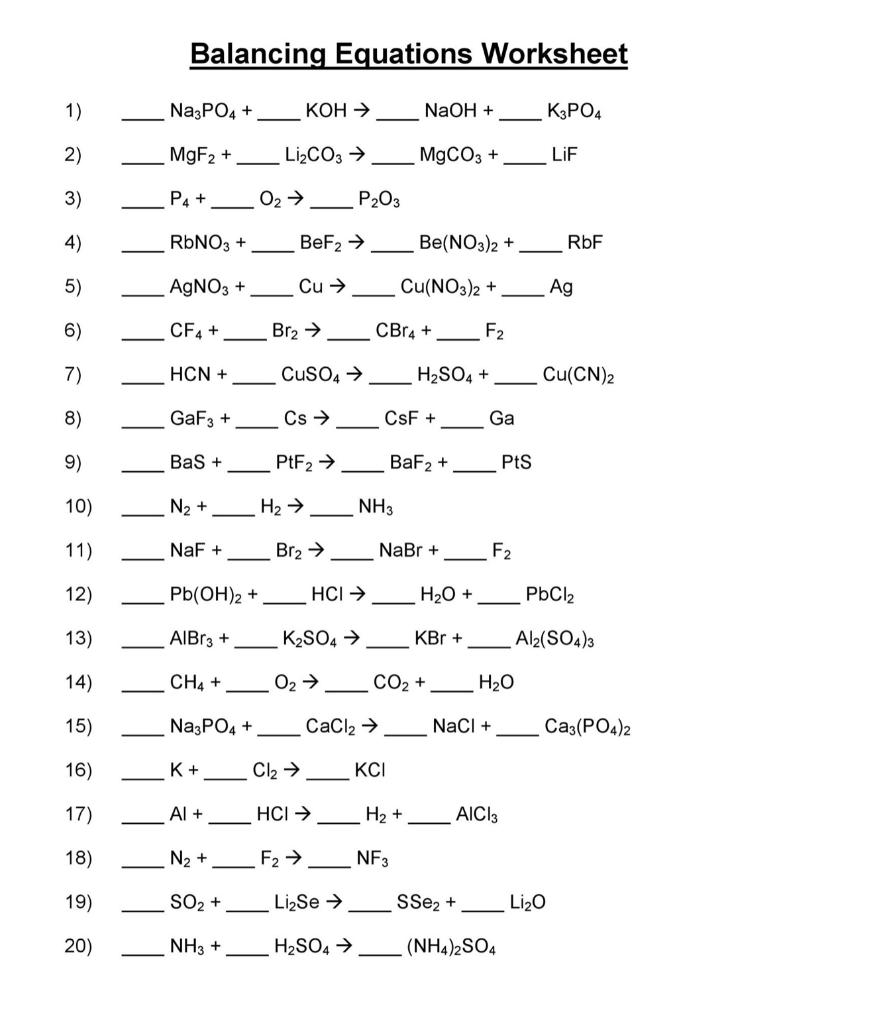 Chemistry balancing equations worksheet answers. Balancing Chemical Equations – Answer Key - Amazon S3 WKS001x019 © 2000 Cavalcade Publishing ( ). All Rights Reserved. Balancing Chemical Equations – Answer Key. How to Balance Equations - Printable Worksheets - ThoughtCo Jan 04, 2019 · Balancing an unbalanced equation is mostly a matter of making certain mass and charge are balanced on the reactants and products side of the reaction arrow. This is a collection of printable worksheets to practice balancing equations. The printable worksheets are provided in pdf format with separate answer keys. Balancing Equations Worksheet - De Anza College W 301. Everett Community College Tutoring Center. Balancing Equations Worksheet. 1). ___ H3PO4 + ___ KOH → ___ K3PO4 + ___ H2O. Chemistry and More - Practice Problems with Answers Dec 08, 2020 · Practice Problems: Writing and classifying equations; Answers. From the Chem Team: Worksheet of mass mole conversions Answers to Worksheet of mass mole conversions . Reactions in Aqueous Solutions. Study Questions; Answers. More Study Questions; Answers. Practice Problems: Determining whether a precipitate forms; Answers . Atomic Structure and ...