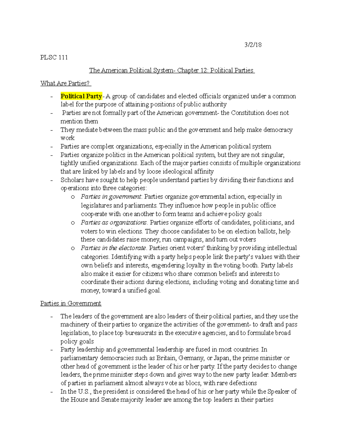 Class 10 Civics Chapter 6 Extra Questions and Answers Political Parties ... Political Parties Class 10 Extra Questions and Answer Civics Chapter 6 Very Short Answers Type. Question 1. Give one reason why multi-party system has evolved in India. Answer: It has evolved in India because of the social and geographical diversity of the country. This diversity cannot be absorbed by two or three parties alone. Chapter 16: Political Parties - Freeman Middle School CHAPTER 16: POLITICAL PARTIES 453 U nlike Italy, the structure ofthe govern-ment in the United States does not need a coalition ofpolitical parties for the government to operate. That does not mean,however,that political parties do not exist in the United States. In a nation as large and diverse as the United States the voice and will of the indi- PDF Lesson 8.3.4 The Origins of Political Parties in America The Origins of Political Parties in America Standard 8.3.4 Understand how the conflicts between Thomas Jefferson and Alexander Hamilton resulted in the emergence of two political parties (e.g., view of foreign policy, Alien and Sedition Acts, economic policy, National Bank, funding and assumption of the revolutionary debt). Enduring Understanding