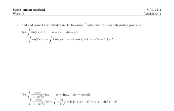 Integration Worksheet - Substitution Method Solutions The following are solutions to the Math 229 Integration Worksheet - Substitution Method. Here's the link to that worksheet ...