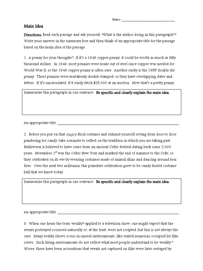 Main Idea Worksheet 4 | Reading Activity - Ereading Worksheets Main Idea Worksheet 4 Here is one more double-sided main idea worksheet. Students read seven passages about money and systems of exchange. They summarize each paragraph, state the main idea, and think of an appropriate title for the passage. Suggested reading level for this text: Grade 5-9 CONTROLS Edit Answers Online Main Idea Worksheet 5 | Reading Activity - Ereading Worksheets Main Idea Worksheet 5 Here's another great activity to help students master main idea. Learn about some of the greatest scientists in human history while reviewing main idea. Read the passages, identify the main idea, and create appropriate titles for each passage. Suggested reading level for this text: Grade 7-11. CONTROLS Edit Answers Online