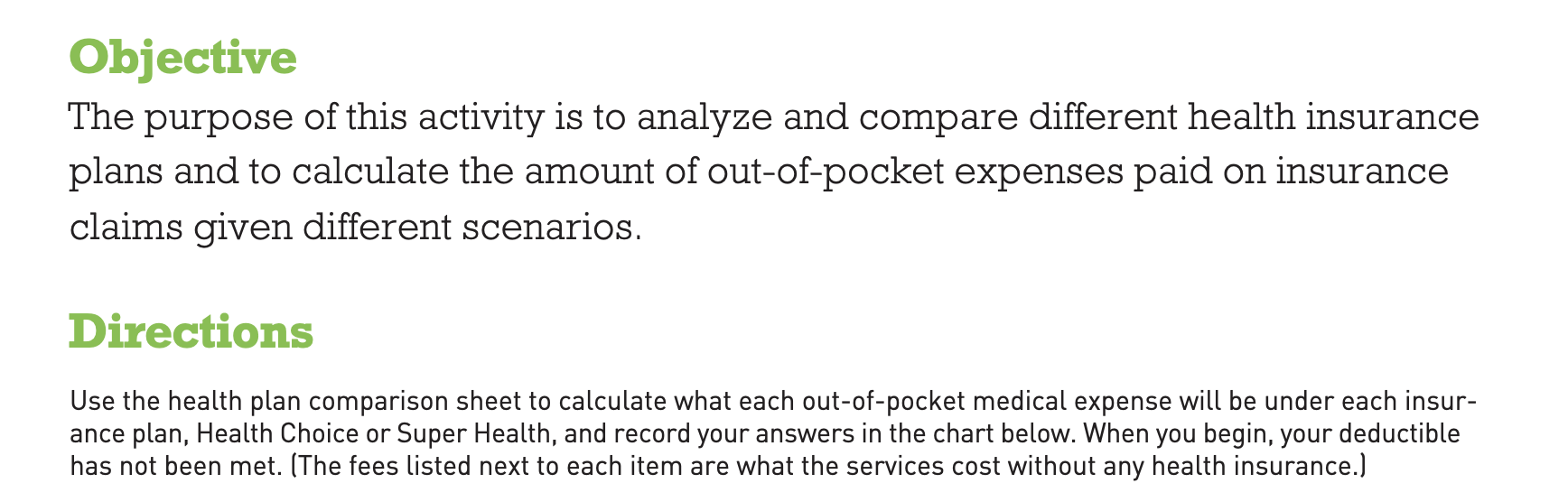Health Insurance Plan Comparison Calculator A Free Calculator to Compare Health Insurance Plans from your Marketplace or Employer Hi and welcome. A couple of items before you get started: 1. You can't use decimals here, except in the percentage fields. They won't "take." Round to dollars. 2. If you let this sit for a while, the server will clear your entries. PDF Marketplace Plan Comparison Worksheet Draft - Beyond the Basics An annual dollar amount that you need to pay out-of-pocket for health care services before your plan starts to pay for services. Some health insurance plans pay for certain services before the deductible is met. Preventive services, such as annual check-ups and immunizations, are covered by your plan before the deductible is met. Password Username Comparing Health Insurance Plans Lesson Plan for 12th - Higher Ed Educator Rating Comparing Health Insurance Plans Students compare and contrast various insurance plans using various types of text, such as brochures. They make a decision about choosing the best health care plan for their needs based on the information they gathered. 3 Views 8 Downloads Concepts healthcare, consumers Additional Tags
