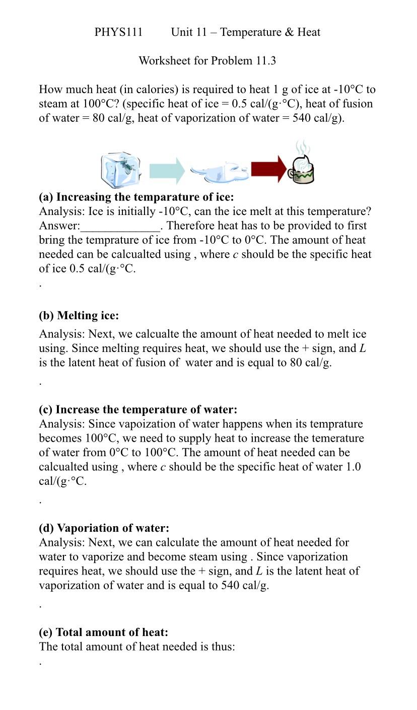 Free Printable Specific Heat Worksheet Answers Collection Free Printable Specific Heat Worksheet Answers Collection The amount of heat required to raise the temperature of one gram of a substance by one Celsius degree is referred to as specific heat. Specific heat is usually measured in calories or joules per gram per Celsius degree. Water, for example, has a specific heat of 1 calorie (or 4.186 joules) per gram per Celsius degree. This is an ...