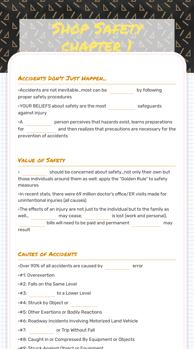 PDF Welding shop safety worksheet - Weebly Welding shop safety worksheet. Safety in the Welding Shop Chapter 1 Learning Objectives • Identify several common causes of accidents • Recognize possible safety hazards in the welding shop or other work environments. • Select and properly use safety equipment appropriate for work conditions. • Recognize and evaluate potential safety ...