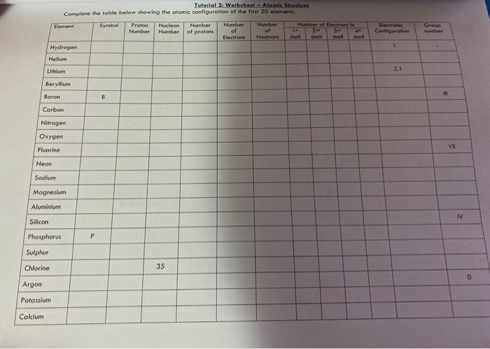 Atomic structure worksheet complete the table answers. Which element has 16 neutrons, 15 protons, and 15 electrons ? - Toppr › cms › libAtomic Structure Worksheet - Washoe County School District Complete the following with the terms "new element", ion, isotope, or molecule. Name: Period: Date: Atomic Structure. You can become mote fafY1iliar with the atomic stfucture of some elements by completing the chart. You have been given enough inf0Émation to fill in all the blahks. (There is no need to use a periodic table.) Sub stance S ymbol ... › lifestyleLifestyle | Daily Life | News | The Sydney Morning Herald The latest Lifestyle | Daily Life news, tips, opinion and advice from The Sydney Morning Herald covering life and relationships, beauty, fashion, health & wellbeing › atomic-structure-andAtomic Structure & The Changing Models of Atom - BioChem Tuition Sep 24, 2015 · Atomic Structure Worksheet. DOWNLOAD ATOMIC STRUCTURE WORKSHEET. SCROLL DOWN FOR VIDEO SOLUTION TO THE ATOMIC STRUCTURE WORKSHEET. Section 1: Multiple Choice Questions. Q1. The isotope cobalt-60 (60 Co) is used to destroy cancer cells in the human body. Which statements about an atom of cobalt-60 are correct? 1. It contains 33 neutrons. 2.