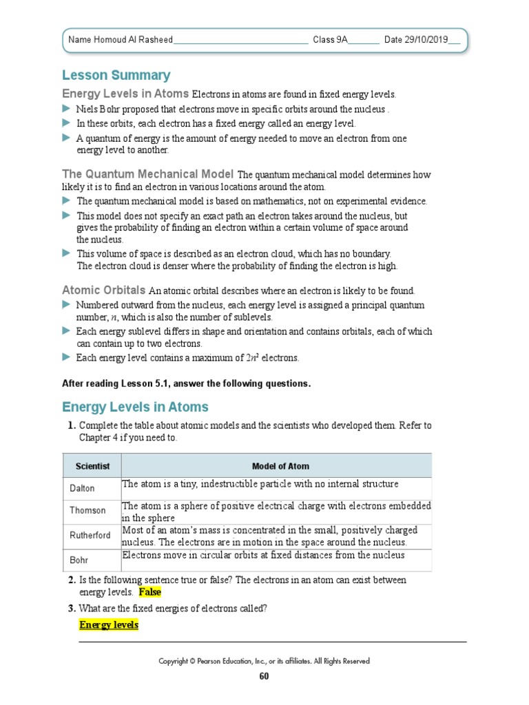 Bohr atomic models worksheet answers