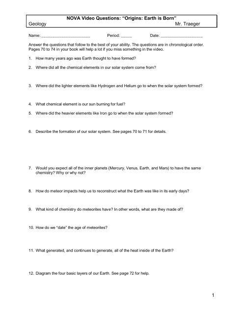 PDF Origins earth is born worksheet answers Origins earth is born worksheet answers Access to this video is an advantage for members through NOVA giving you stories from the front lines of science and engineering, and answering the big questions today and tomorrow, from how our ancestors lived, to whether parallel universes exist, to how technology will change our lives.