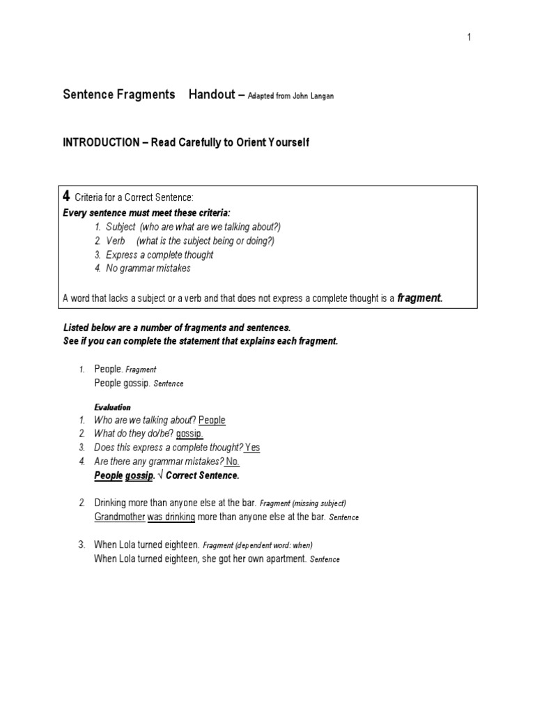 Fragments and Run-On Sentences Worksheet | Sentence Structure Activity Fragments and Run-On Sentences Worksheet Here's some practice with sentence fragments and runon sentences. Each of the sentences in this worksheet is either a fragment or a run-on. Students rewrite the sentences so that they are grammatically correct. CONTROLS Edit Looking for More Sentence Structure Worksheets and Activities? PDF Correcting Sentence Fragments - New England College Tutoring Center Correcting Sentence Fragments A sentence fragment is a word group that is capitalized and punctuated as a sentence, but is not a sentence. A sentence needs at least one independent clause which contains a subject and a verb, and expresses a complete thought.A subject is the spotlight of a sentence (what the sentence is about), and a verb describes an action, occurrence, or ...