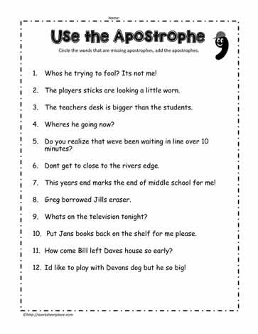 Apostrophe Worksheets Apostrophe Worksheets. How to use an apostrophe. Apostrophe worksheets, punctuation worksheets, punctuation lesson plans. Learn how too use the apostrophe ... Browse Printable Apostrophe Worksheets | Education.com Get more practice spelling with plurals and possessives in this middle school grammar worksheet! 6th grade. Reading & Writing. Worksheet. Browse Printable 7th Grade Apostrophe Worksheets | Education.com Get more practice spelling with plurals and possessives in this middle school grammar worksheet! 7th grade. Reading & Writing. Worksheet. 50 English ESL worksheets pdf & doc: apostrophe - ISL Collective As a privacy company, we do NOT exchange data with third-party service providers to serve ads, follow your behavior around the web, or sell your data. The data ...