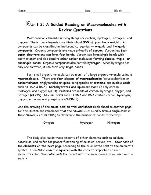 Macromolecule Worksheet Answer Key Pdf - pdfFiller Biological Macromolecules Worksheet Exercise 1. A. Draw either the molecular or structural formula for each of the following organic molecules. 1 glucose 2 triglyceride 3 phospholipid 4 amino acid B. for each of the following polymers draw or otherwise define the monomer units that make up the polymer to the rest of the community. Marocmolecule review worksheet - answer key - Macromolecules Review ... Macromolecules Review Worksheet for H Biology Part A. Classify each as a carbohydrate, protein, or lipid. 1. carbohydrate Starch 9. carbohydrate Polysaccharide 2. lipid Cholesterol 10. lipid Phospholipid 3. lipid Steroid 11. neither, but is a key component of a lipid Glycerol 4. carbohydrate Glycogen 12. carbohydrate Monosaccharide 5. protein enzyme 13. carbohydrate Cellulose 6. lipid ... Macromolecules Building Blocks Of Life Worksheet Answer Key Macromolecules Building Blocks Of Life Worksheet Answer Key | NEW 5468 kb/s 10128 Building Blocks Of Life Worksheet Answer Key.docx 1. a protein 2. the nitrogen bonded to the two carbon atoms 3.The four lines surrounding the "C" represent the four bonds that carbon can form.