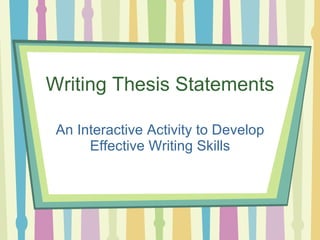 How to Write a Perfect 3-Point Thesis Statement With Samples ... Jun 13, 2020 · A vague thesis statement is incomprehensible to readers rendering the essay unclear. Being part of a final paper, writers must follow all the instructions regarding academic writing. In this case, writing a strong 3-point thesis statement requires writers to adopt a non-technical language and eliminate vague and abstract words. Exercise in Identifying Effective Thesis Statements - ThoughtCo Aug 07, 2019 · Keep in mind that an effective thesis statement should be sharply focused and specific, not just a general statement of fact. When you're done, you may want to discuss your answers with your classmates, and then compare your responses with the suggested answers on page two.