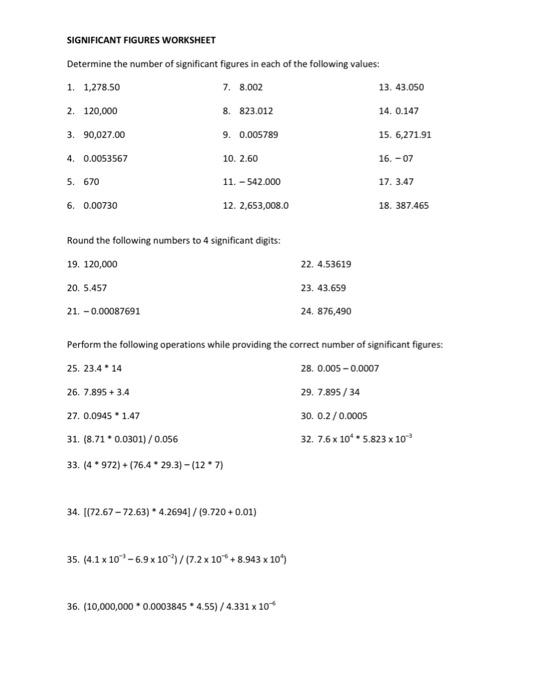 Significant Figures Chemistry Teaching Resources | TpT Chemistry Task Cards Measurement, Significant Figures, Scientific Notation by Science With Mrs Lau 4.9 (47) $9.00 Zip Review, quiz, or play games with these Chemistry Task Cards Set that feature Measurement, Scientific Notation, and Significant Figures! Worksheet 1 - Scientific notation/ significant figures Worksheet 1 Scientific Notation/Significant Figures 1. Convert each of the following into scientific notation. 2. Determine the number of significant figures in each of the following: 3. Convert each into decimal form. 4. Calculate the following. Give the answer in correct scientific notation. a) 4.53 x 105 b) 1913.0 + 2.2 x 106 - 4.6 x 103 Significant Figures Worksheet - Easy Hard Science - learnwithdrscott.com The Significant Figures Worksheet covers sig figs, as they say, a topic found in chemistry classes that doesn't exactly look like chemistry. In Plain English, significant figures are used for rounding numbers. Rounding is a simple concept we usually learn in elementary school. We all know how to round: 0-4 round down, and 5-9 rounds up. Significant Figures Worksheet With Answers Pdf Chemistry Student Worksheet: Time Of Flight Mass Spectrometry ... Give your answer to the appropriate number of significant figures. Show your working. [2 marks] Example answers 01.1 high energy electrons from hot cathode / electron gun fired at sample knocks off one electron 01.2 sample dissolved in volatile solvent injected through a fine hypodermic needle giving a fine mist / aerosol tip of needle ...