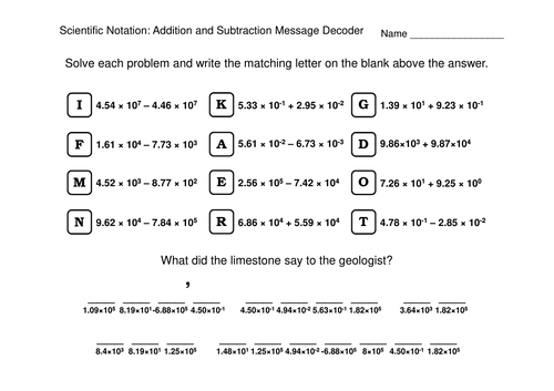 Adding and subtracting scientific notation worksheet with answers. Adding and Subtracting with Scientific Notation Worksheet ADDING AND SUBTRACTING WITH SCIENTIFIC NOTATION WORKSHEET. Problem 1 : Evaluate : (1.328 x 107) + (2.034 x 105). Problem 2 : Evaluate :. Scientific Notation Addition and Subtraction Worksheets These lessons and worksheets show you how to perform sums and differences with values that are in scientific notation. Scientific Notation 9.6b - Big Ideas Math To add or subtract numbers written in scientific notation with different powers of 10, first rewrite the numbers so they have the same power of 10.2 pages Adding Subtracting Scientific Notation Worksheet - Pinterest Jul 8, 2020 - Adding Subtracting Scientific Notation Worksheet - 50 Adding Subtracting Scientific Notation Worksheet , Dividing Numbers is Scientific ...