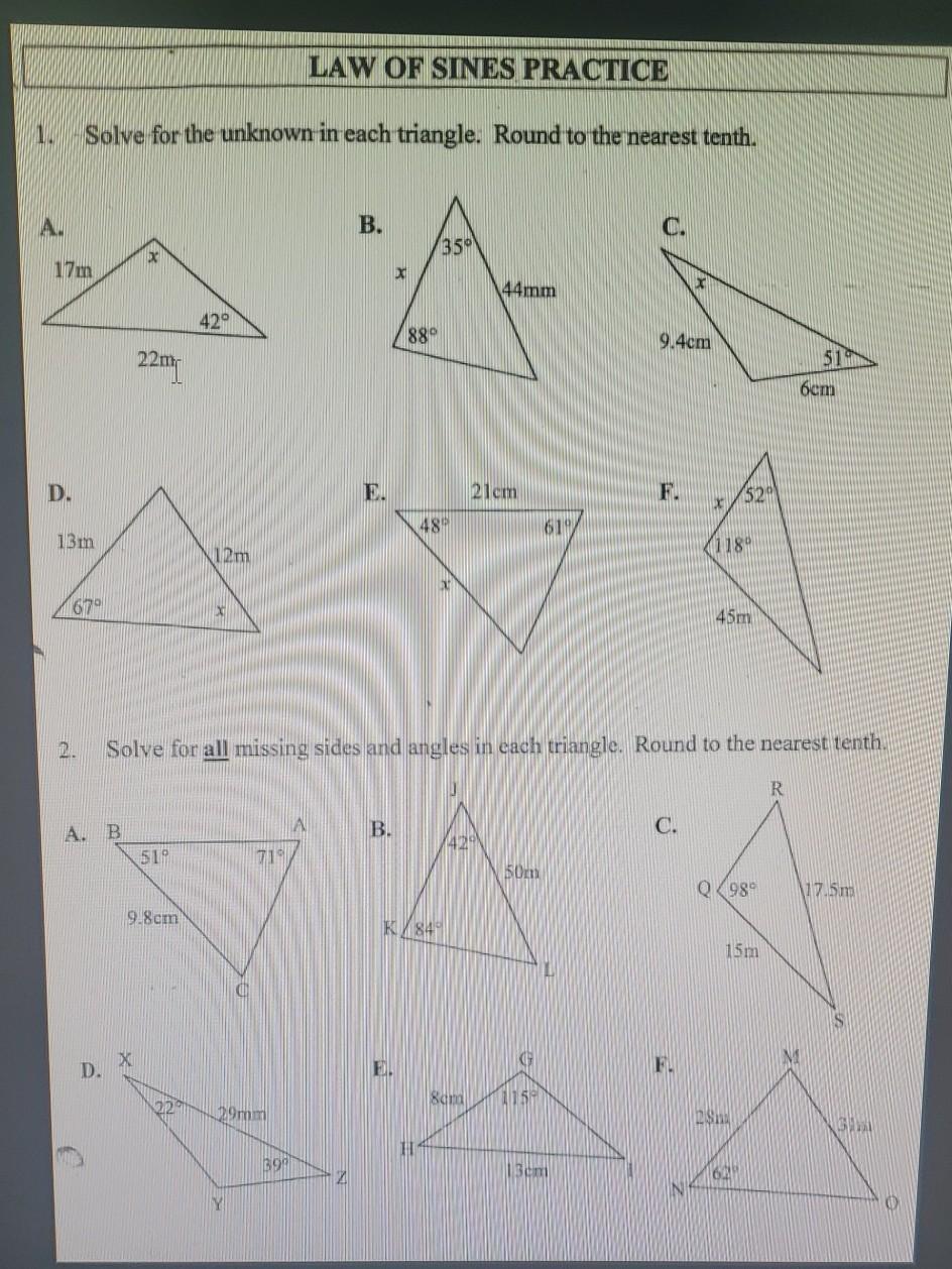 PDF LAW OF SINES PRACTICE - AlamandaMaths LAW OF SINES PRACTICE ANSWER KEY 1. Solve for the unknown in each triangle. Round to the nearest tenth. A. B. C. o D. E. F. 2. Solve for all missing sides and angles in each triangle. Round to the nearest tenth. ... SINE LAW WORKSHEET #1 Author: ADHS Created Date: 12/5/2013 10:25:36 AM ...