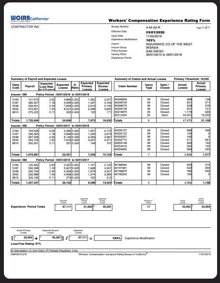 Experience Rating in Workers Compensation - The Balance Small Business If your premiums were $4500, $5500 and $4800 during the experience period, you would qualify for experience rating based on the first criteria. Rating Worksheet When the NCCI or a state bureau issues an experience modifier, the agency provides an experience rating worksheet. The worksheet shows how your modifier was calculated. Key Information for Interpreting the Work Comp Experience Mod Worksheet NCCI uses a decimal basis whereas some states present the ELR without a decimal. NCCI may present the ELR as 2.35 while a state rate bureau may use 235. If there is no decimal, remember to input it following the second number from the right (235 = 2.35 and 076 = 0.76). The ELR is applied to the audited payroll to develop expected losses. Understanding Your Experience Rating Worksheet - WorkCompLab On the Experience Rating Worksheet, the remaining five columns are shown on the right side of the sheet. These are concerned with any claims you file, along with any actual losses your business has sustained. Claim Data This is where your business' claims are listed—beneath the Claims Data heading. They are listed by number. National Council on Compensation Insurance - Missouri NCCI is Missouri's approved advisory organization pursuant to Section 287.955 RSMo. Every workers' compensation insurer is required to adhere to the bureau's uniform statistical and experience rating plan and classification system. Educational materials Basics of experience rating ABCs of experience rating
