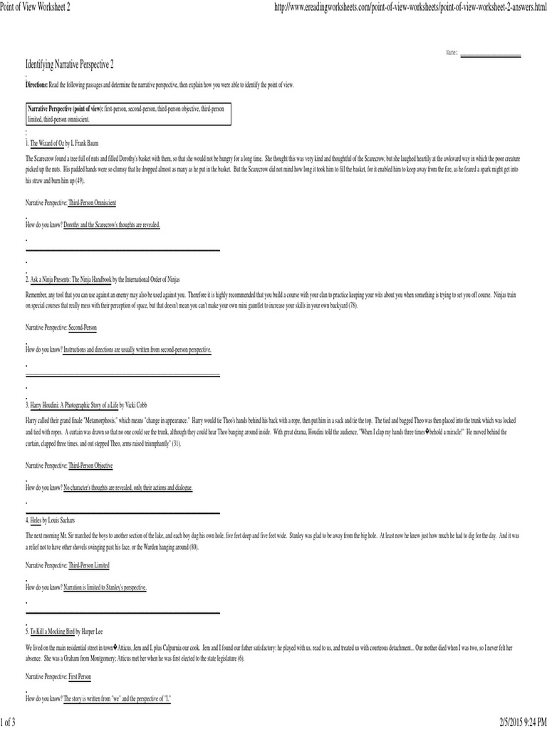 Point of View Worksheet 11 | PDF If it is third-person, circle each time characters' thoughts or feelings are narrated. Explain your answers in the box. Viewpoints: first-person, second-person, ... Point of View Worksheet 11 | Answers Point of View Worksheet 11. This worksheet features 9 quirky passages. Students read each passage, identify the narrator's viewpoint, and explain their ...