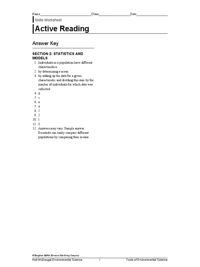 Active Reading: Answer Key | PDF | Mean | Statistics - Scribd Name________________________________Class____________________Date____________________. Skills Worksheet. Active Reading Answer Key SECTION 2: STATISTICS AND