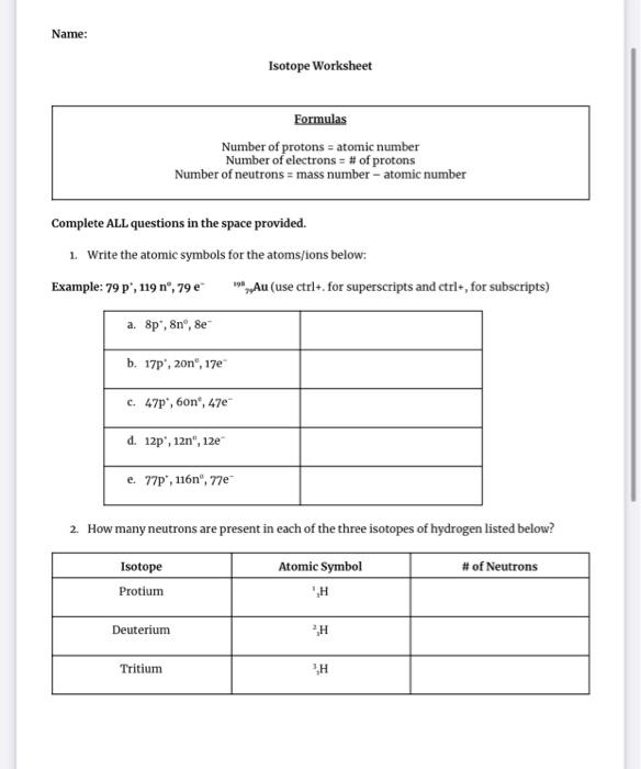 DOC ISOTOPES, IONS, AND ATOMS WORKSHEET - sfponline.org ISOTOPES, IONS, AND ATOMS WORKSHEET Atomic # = # of protons. Mass # = Atomic # + neutrons. Protons = electrons when charge is zero. Atomic # Mass # # p+ # e- # n0 charge Symbol 1) 17 19 0 2) 180 71 109 3) 40 38 46 4) 92 238 86 5) 206 Pb4+ 82 6) 34 45 -2 7) 113 48 49 8) 21 42 0 9) 31 P3- Isotopes Ions and Atoms Worksheet Answer Key Form - signNow Handy tips for filling out Ions worksheet answer key pdf online. Printing and scanning is no longer the best way to manage documents. Go digital and save time with signNow, the best solution for electronic signatures.Use its powerful functionality with a simple-to-use intuitive interface to fill out Isotopes worksheet answers online, e-sign them, and quickly share them without jumping tabs.