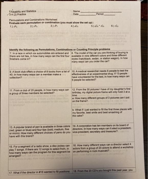 Permutations and combinations worksheet answers. El Gizmos - ExploreLearning Find Your Solution. Start playing, exploring and learning today with a free account. Or contact us for a quote or demo. Sign Up For Free Get a Quote Permutation Worksheets - Math Worksheets 4 Kids In this set of pdf worksheets, find the number of permutations using the formula. There are five problems in each worksheet. Number of Unique Permutations Based on the given words, high school students should observe for repetition of letters and use the formula to calculate unique permutation. Evaluate - Level 1 Solved PERMUTATIONS AND COMBINATIONS WORKSHEET Identify each - Chegg Statistics and Probability questions and answers; PERMUTATIONS AND COMBINATIONS WORKSHEET Identify each as either a Permutation or a Combination: (No need to solve) 1. In a race where there are 6 automobiles entered, and there are no ties, in how many ways can the first 4 finishers come in? 2. Classroom Resources - National Council of Teachers of Mathematics When students become active doers of mathematics, the greatest gains of their mathematical thinking can be realized. Both members and non-members can engage with resources to support the implementation of the Notice and Wonder strategy on this webpage.