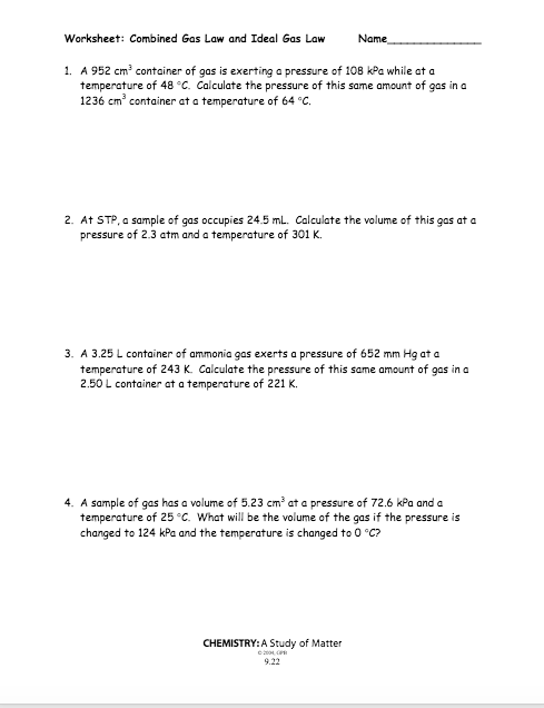 PDF Combined And Ideal Gas Laws Wks Answers Worksheet: Combined Gas Law and Ideal Gas Law Name 1. A 952 cm3 container of gas is exerting a pressure of 108 kPa while at a temperature of 48 QC. Calculate the pressure of this same amount of gas in a 1236 cm3 container at a tem ature of 64 cc. 2. At STP, a sample of gas occupies 24.5 mL. Calculate the volume of this gas at a