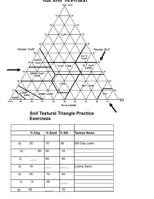 M127 Soil Texture Assignment.pdf - Course Hero THE SOIL TEXTURAL TRIANGLE Soil Textural Triangle Practice Exercises % Clay ... Soil Texture WorksheetName________________Date_________________Directions: ... › lifestyleLifestyle | Daily Life | News | The Sydney Morning Herald The latest Lifestyle | Daily Life news, tips, opinion and advice from The Sydney Morning Herald covering life and relationships, beauty, fashion, health & wellbeing Texture Triangle Worksheet-1 | PDF | Loam | Agroecology - Scribd Name: Class: Date:______. THE SOIL TEXTURAL TRIANGLE. Soil Textural Triangle Practice Exercises. % Sand % Silt % Clay Texture Name. a) 75 10 15 sandy loam.