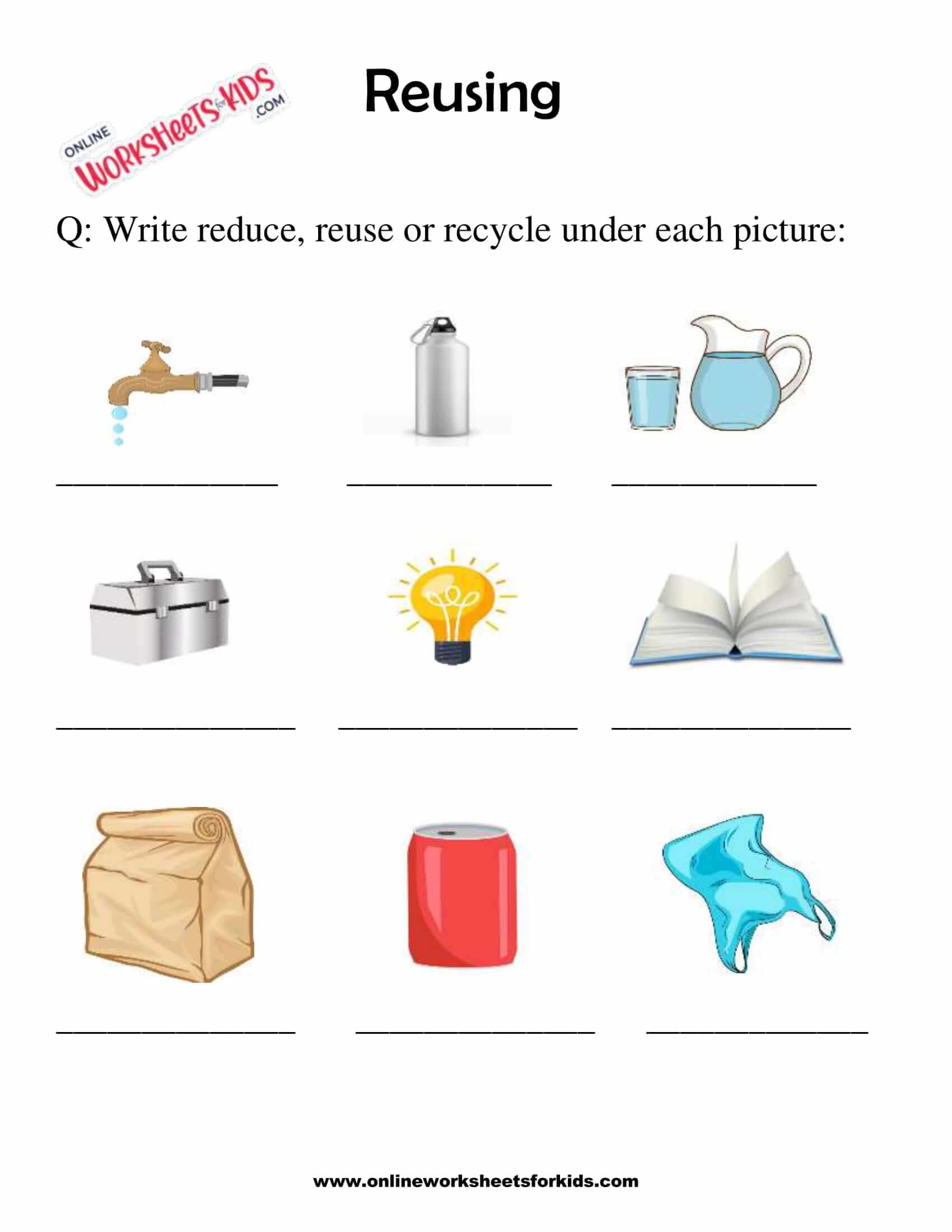 Reduce, reuse and recycle worksheets | K5 Learning Reduce, re-use and recycle worksheets. Following the three R's (reducing material usage, reusing materials and recycling used materials) helps us protect the environment. Students identify which of the three R's is the best way to deal with each item pictured. Free | Worksheets | Kindergarten | Science.