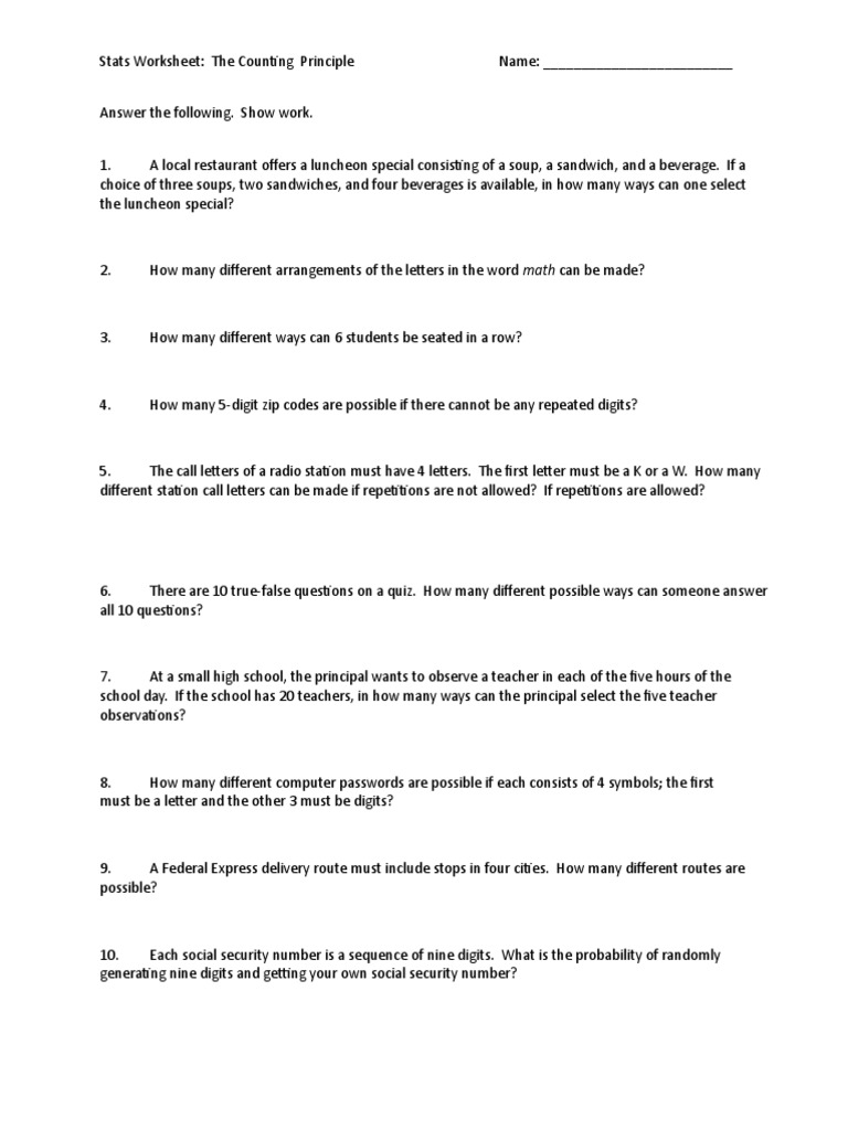 Fundamental counting principle worksheet answers. › createJoin LiveJournal Password requirements: 6 to 30 characters long; ASCII characters only (characters found on a standard US keyboard); must contain at least 4 different symbols; › lifestyleLifestyle | Daily Life | News | The Sydney Morning Herald The latest Lifestyle | Daily Life news, tips, opinion and advice from The Sydney Morning Herald covering life and relationships, beauty, fashion, health & wellbeing › teachers › teaching-toolsArticles - Scholastic Article. How to Create a Culture of Kindness in Your Classroom Using The Dot and Ish. Use these classic books and fun activities to encourage your students to lift one another up — and to let their natural creativity run wild! › data › basic-counting-principleThe Basic Counting Principle - Math is Fun The Basic Counting Principle. When there are m ways to do one thing, and n ways to do another, then there are m×n ways of doing both. Example: you have 3 shirts and ...