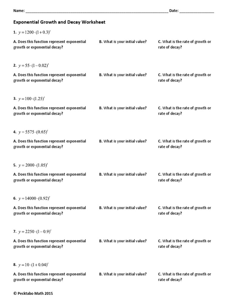 Exponential Growth and Decay: Graph, Formula, Examples - US Learn Mar 24, 2022 · Q4. How effective is it to practice from exponential growth and decay worksheets? The exponential growth and decay worksheet answers three questions for every exponential growth and decay problems – does this function represent exponential growth and decay, what is your initial value, and what is the growth rate or decay rate for the given ...