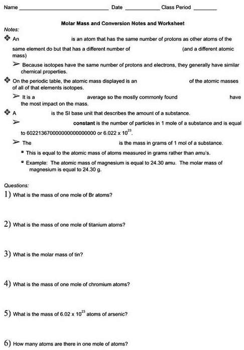 Mole Conversions Worksheet Chemistry 1b Answer Key The Mole And Molar Mass Worksheets Answers | Chemistry worksheets. 8 Pictures about The Mole And Molar Mass Worksheets Answers | Chemistry worksheets : 11-3 Mole Conversions Answers - Mole Conversions Answers Chem Worksheet, Moles Mass And Particles Worksheet - Ivuyteq and also Molar Mass Practice Worksheet 2 Answer Key - Vegan Divas NYC. WS 11-3 Mole Conversions.pdf - Mole Conversions Name _ Chem Worksheet ... Name ________________Mole Conversions Chem Worksheet 11-3 Mole Conversion Strategy Mass (grams) Amount (moles)Volume of gas (liters) Particles (atoms, molecules, formula units) 6.02 × 1023particles/molmolar mass (g/mol) 22.4 L/mol End of preview Upload your study docs or become a member. View full document Newly uploaded documents The Cavalcade o' Chemistry | Celebrating over 20 years of ... Oct 13, 2022 · P. Electrochemistry & redox (3) P. Solutions & concentration (7) Q. Nuclear chemistry (5) R. Thermo, kinetics, equilibria (12) S. Organic chemistry (3) T. Solids, identifying unknowns (3) U. Reference tables (3) Practice worksheets. A. Scientific method & graphing (3) B. Unit conversions (4) C: Significant figures (7) D. Atomic theory ...