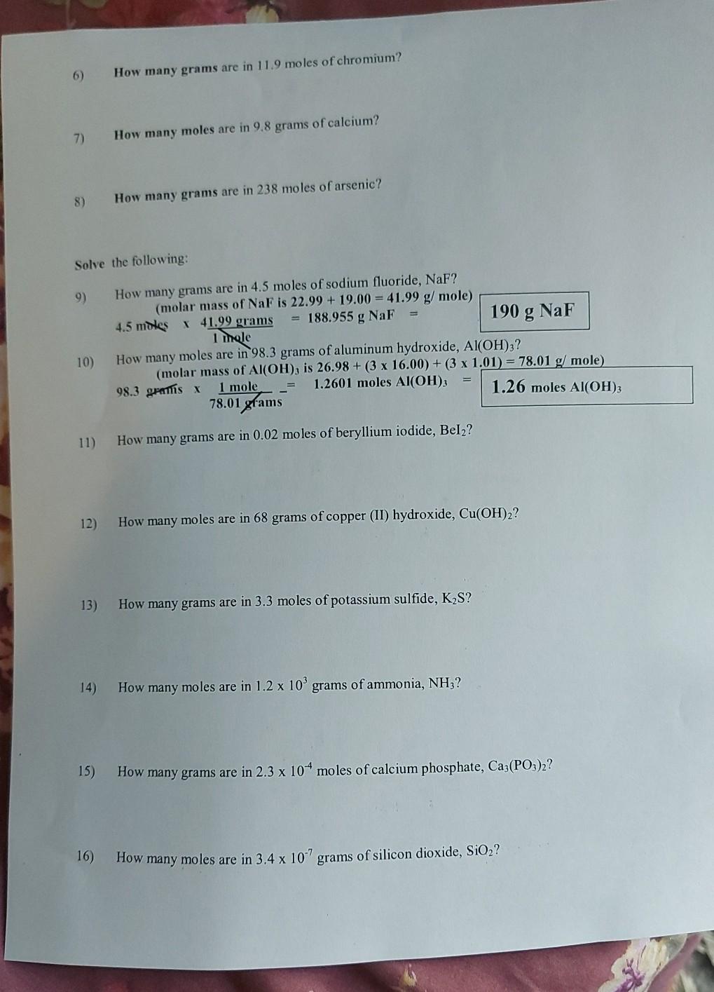 Worksheet - Mole Conversions - Quia Worksheet - Mole Conversions Name: Show all work utilizing dimensional analysis wherever possible. Include all units and account for significant figures. A. What is the molar mass of: (make sure to show clearly defined and complete work here) 1. H2 2. Ba(OH)2. 3. CO 4. NH4Cl. 5. NiSO4 6. Al(NO3)3. Conversion between moles and mass