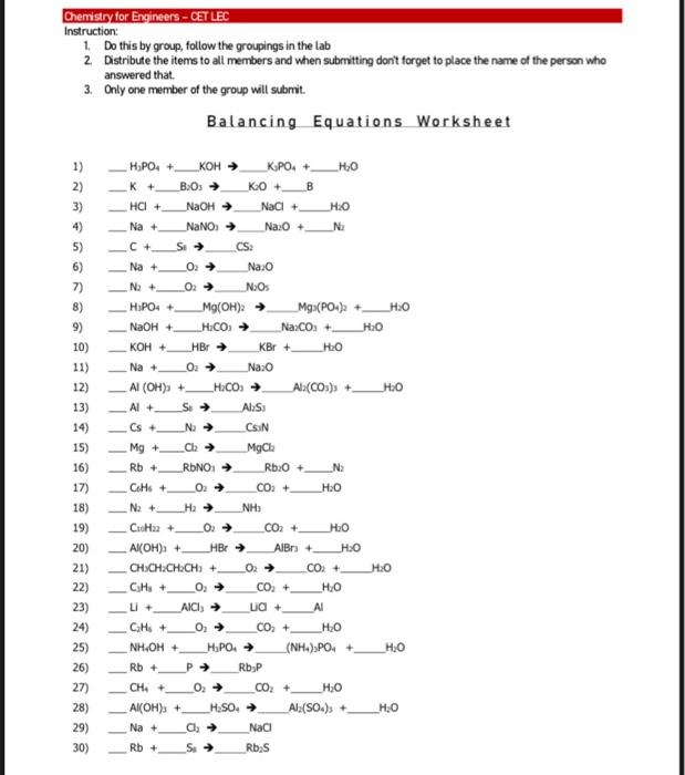 W 301. Everett Community College Tutoring Center. Balancing Equations ... 5. C7H6O2 + O2 → CO2 + H2O.Worksheet #1: Writing and Balancing Formula Equations. 5. Balancing Chemical Equations Worksheet 1. 6. Teaching Transparency Worksheet Balancing Chemical. 7. Balancing Chemical Reactions. 8. Chapter 7 Worksheet 1 Balancing Chemical Equations Answer Key.This is a collection of printable worksheets to practice ...