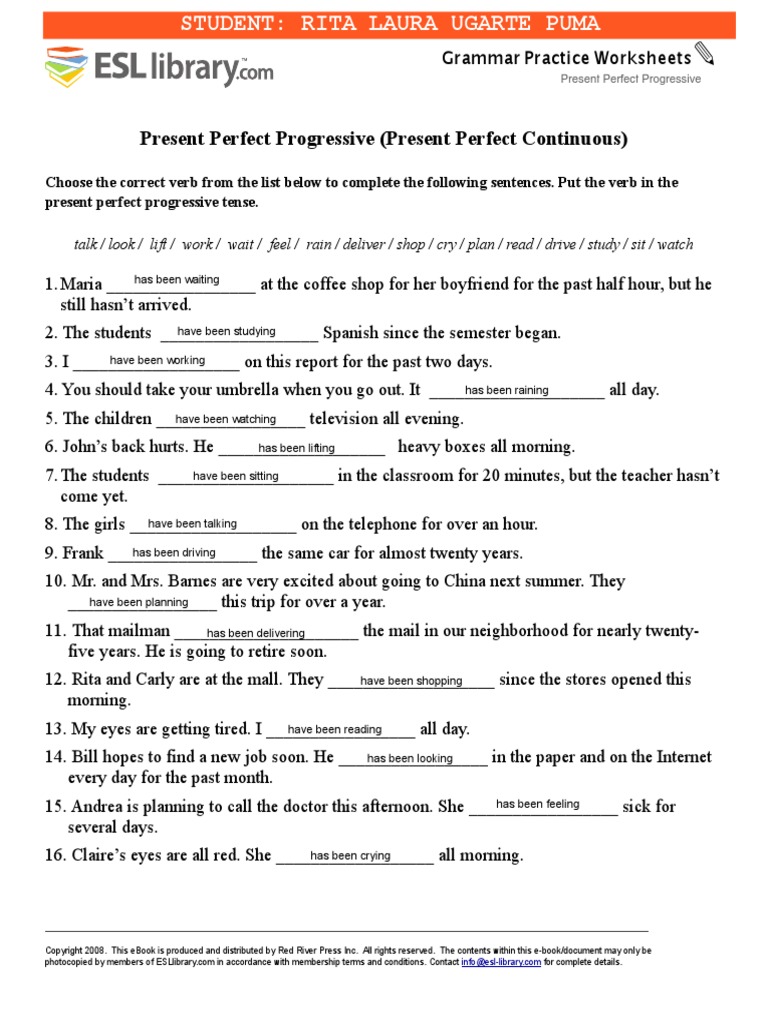 425 English ESL worksheets pdf & doc: present perfect tenses A selection of English ESL present perfect tenses printables. ... Some exercises to practice the present perfect tense. Thanks for sharing. :-)). 4863 uses. Present Perfect ESL Activities Games Worksheets - Teach This ESL Present Perfect Worksheet - Grammar Exercises: Categorising, Writing Sentences, Sentence Completion - Speaking Activity: Discussion, Communicative Practice ... Present Perfect Simple - All Things Grammar Quality ESL grammar worksheets, quizzes and games - from A to Z - for teachers & learners. PRESENT PERFECT ... competition using the present perfect tense.
