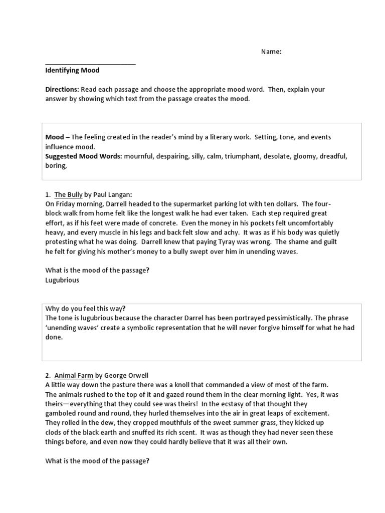 Mood and Tone Worksheets - Easy Teacher Worksheets These worksheets will help students learn to identify and breakdown the mood and tone of a work. Get Free Worksheets In Your Inbox! Printable Mood and Tone Worksheets Click the buttons to print each worksheet and answer key. Where Does It Sit? For each passage below, write the tone and the mood of the passage.