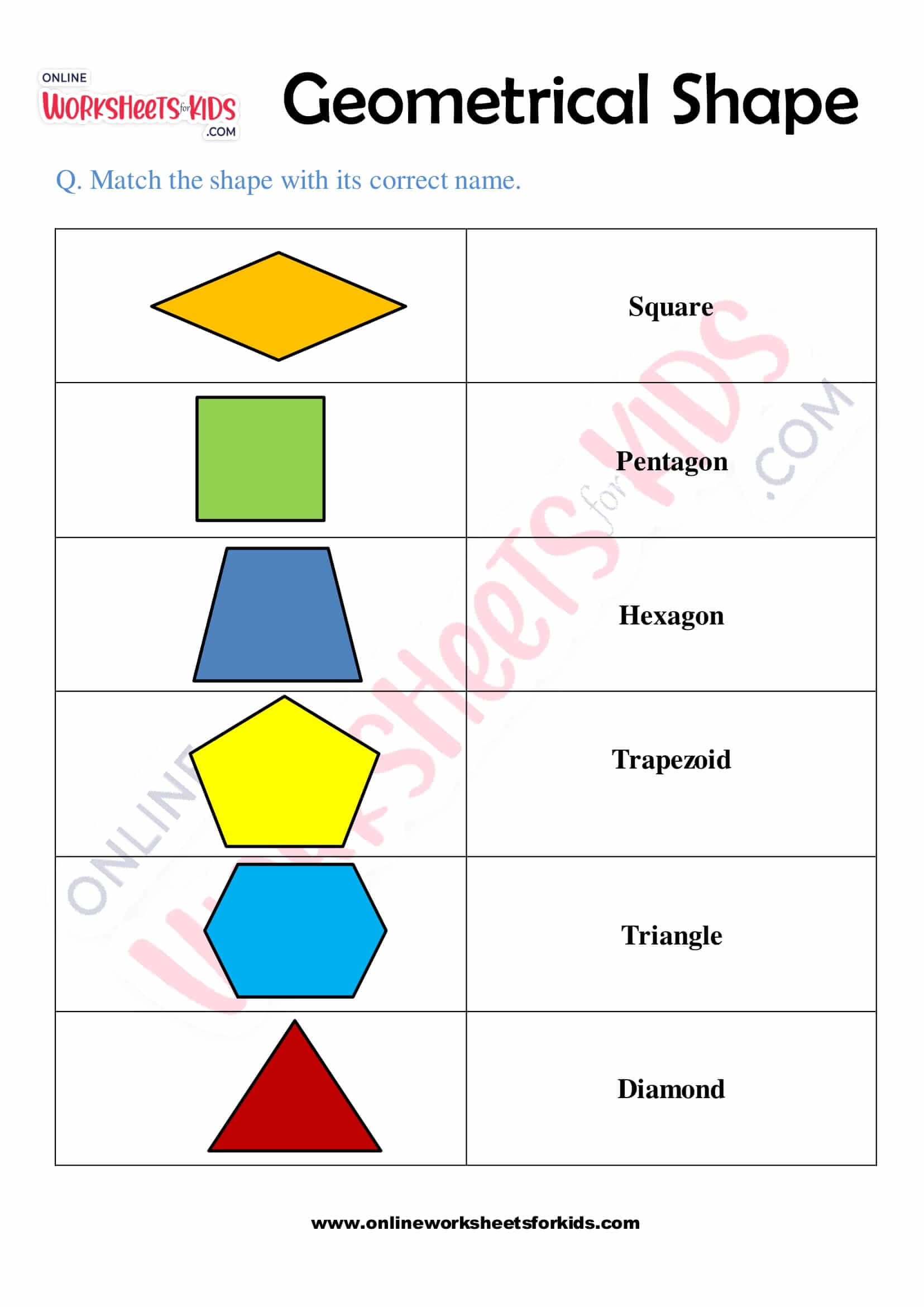 Identify 2D Shapes Worksheets | K5 Learning Identify 2D Shapes Geometry worksheets: the basic two dimensional shapes In the first worksheet, students are asked to identify squares, rectangles, triangles and circles. The second worksheet covers rectangles, pentagons and hexagons. Rectangle - square - triangle - circle: Worksheet #1 Rectangle - pentagons - hexagons: Worksheet #2 10 shapes: