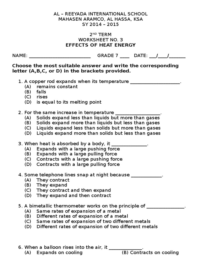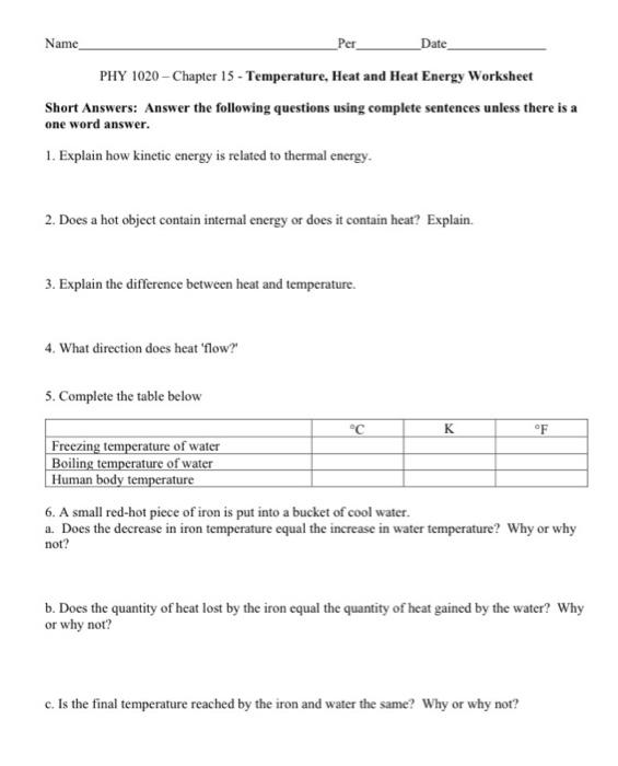 Heat and temperature worksheet