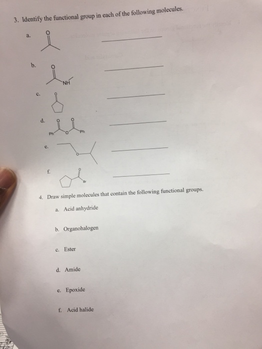 Solved FUNCTIONAL GROUP IDENTIFICATION WORKSHEET Identify - Chegg Chemistry questions and answers. FUNCTIONAL GROUP IDENTIFICATION WORKSHEET Identify the functional groups on the following organic molecules Carb Acid # - ester - amice (HC) -aicono alkyl halide HH 1 halo alkane) 2. Draw simple organic molecules that contain the following functional groups. f Cycloalkane 8. Amine h. Ether i Thiol j.