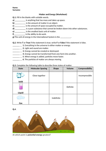 Matter and energy worksheet