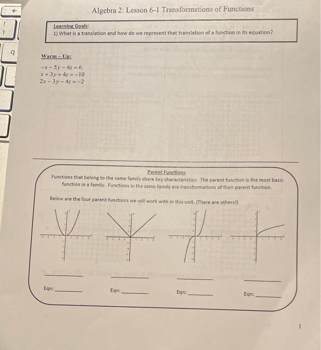 1-5 Parent Functions and Transformations - PreCalculusCoach.com 1-5 Parent Functions and Transformations Worksheet ⋆ PreCalculusCoach.com 1-5 Parent Functions and Transformations Here is your free content for this lesson! Parent Functions and Transformations Worksheet, Word Docs, & PowerPoints 1-5 Assignment - Parent Functions and Transformations 1-5 Bell Work - Parent Functions and Transformations