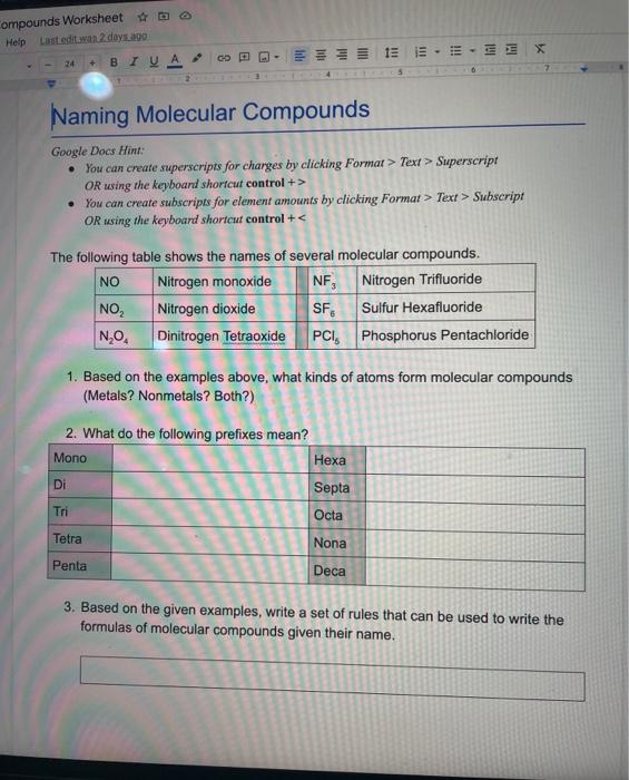 Naming molecular compounds worksheet answers. Quiz & Worksheet - Naming Ionic Compounds | Study.com Practice naming ionic compounds and perfect your skills with this interactive quiz and printable worksheet. We highly recommend using this tool to... Microsoft takes the gloves off as it battles Sony for its Activision ... 12. lokak. 2022 · Microsoft is not pulling its punches with UK regulators. The software giant claims the UK CMA regulator has been listening too much to Sony’s arguments over its Activision Blizzard acquisition. Quiz & Worksheet - Lewis Structures | Study.com About This Quiz & Worksheet. The quiz will present you with different compounds and then ask you to identify the correct Lewis dot diagram. It will also ask you to identify the various conventions ... Naming Molecular Compounds Naming Molecular Compounds General Instructions: Please do the activities for each day as indicated. Any additional paper needed please attach. Submitted Work: ... Use your answers to Questions 9–11 to write a guideline for how and when to modify a …