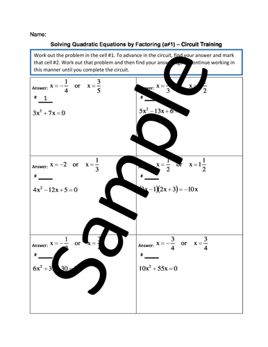 Factoring Quadratic Equations Worksheet and Answer Key - mathwarehouse Students will practice solving quadratic equations by factoring and, in the bonus problems, applying their knowledge to area of a rectangle. Example Questions Question 1) Solve: x 2 + 5x + 6 = 0 Question 4) t 2 + 2t - 19 = 5 Question 7) 2x 2 + 6x + 4 = 0 Question 16) 4n 2 + 12n + 9 = 0 Question 20) 3x 3 + 21x 2 + 36x = 0 Other Details
